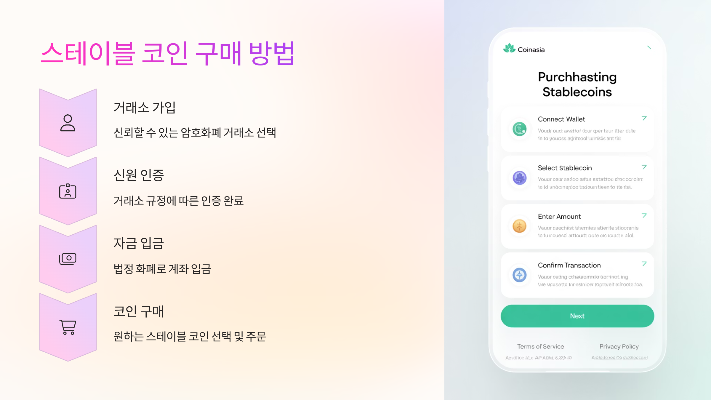 - 코인 구매: 스테이블 코인을 선택하고 주문을 진행합니다.
