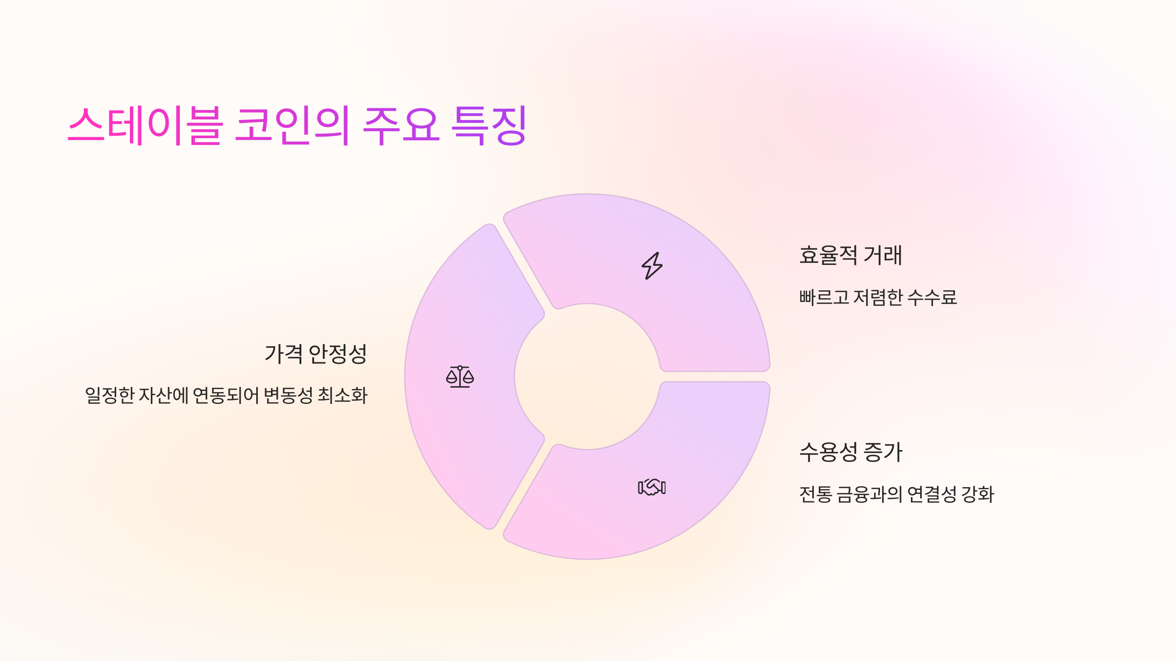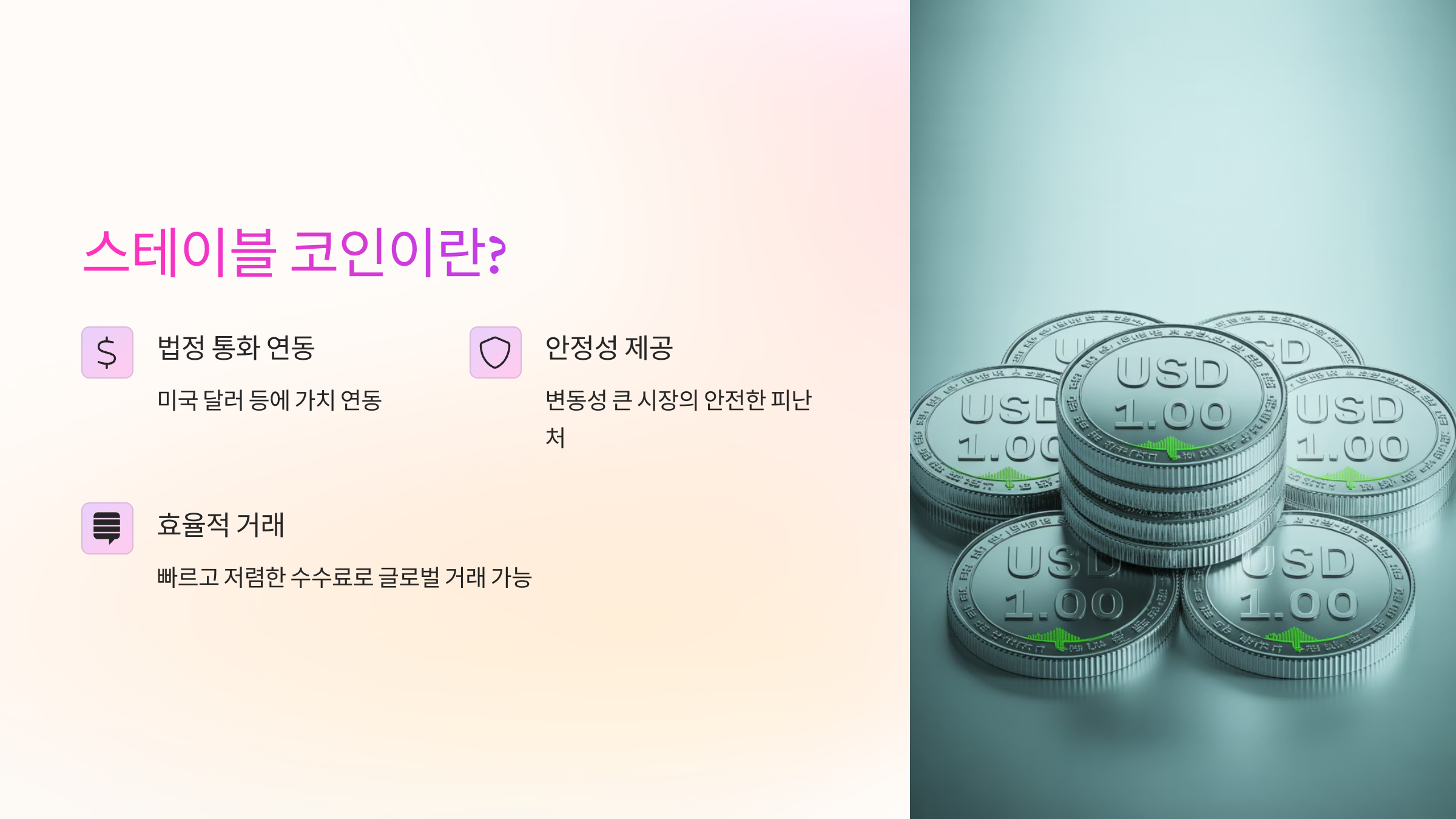- 가격 안정성: 값이 일정한 자산에 연동되어 가격이 크게 변동하지 않습니다.