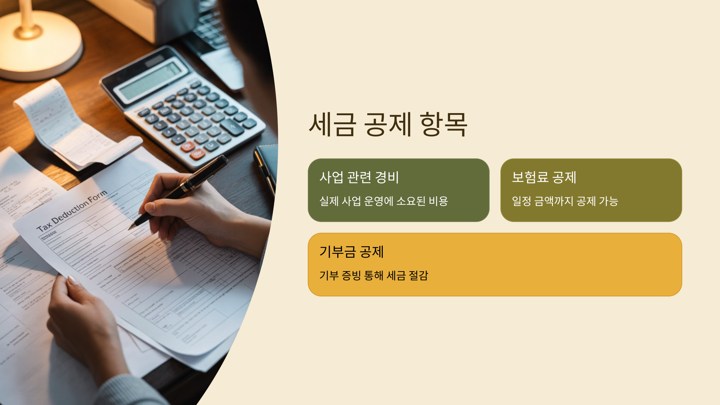 사업 관련 경비는 실제 사업 운영에 소요된 비용을 포함하며, 이러한 비용을 잘 정리하고 증명할 수 있다면 소득세를 줄이는 데 큰 도움이 됩니다. 또한, 보험료나 기부금도 일정 금액까지 공제 받을 수 있으므로, 이를 잘 활용하는 것이 필요합니다.
