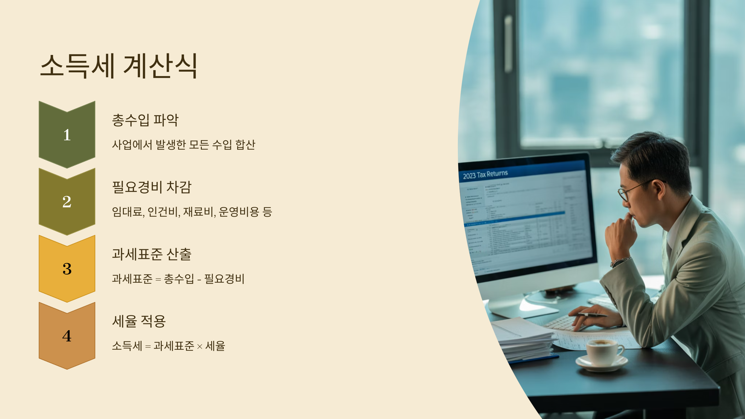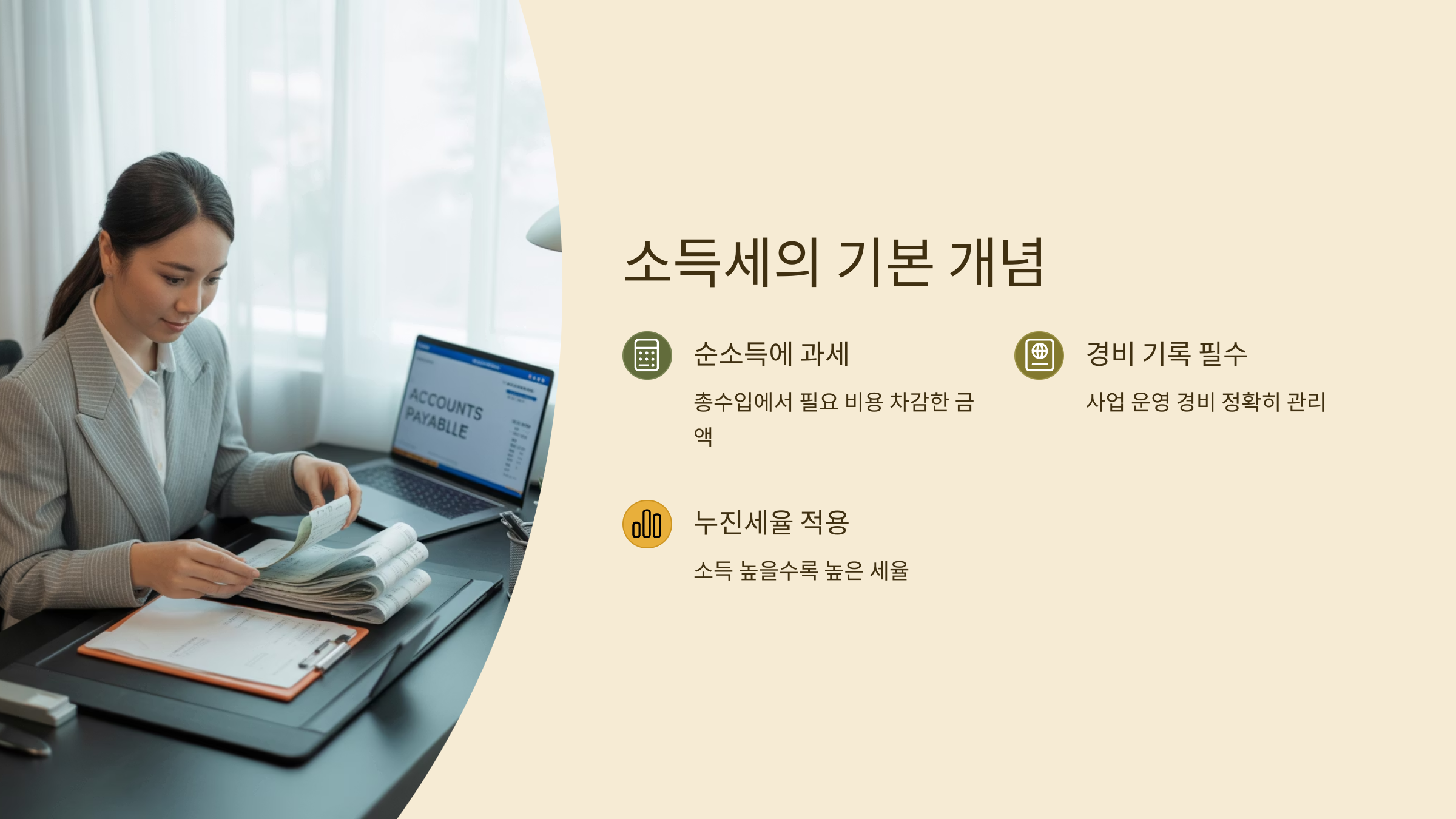 소득세는 개인이 얻은 소득에 대해 국가에 납부하는 세금으로, 개인사업자의 경우 사업에서 발생한 순소득에 대해 과세됩니다. 여기서 순소득이란 총수입에서 필요한 비용을 차감한 금액을 의미합니다. 따라서 개인사업자는 자신의 사업 운영에 필요한 경비를 정확히 기록하고 관리해야 소득세를 올바르게 계산할 수 있습니다. 이를 위해서는 소득세의 과세 표준을 이해하고, 적절한 공제 항목을 적용하는 것이 필수적입니다.