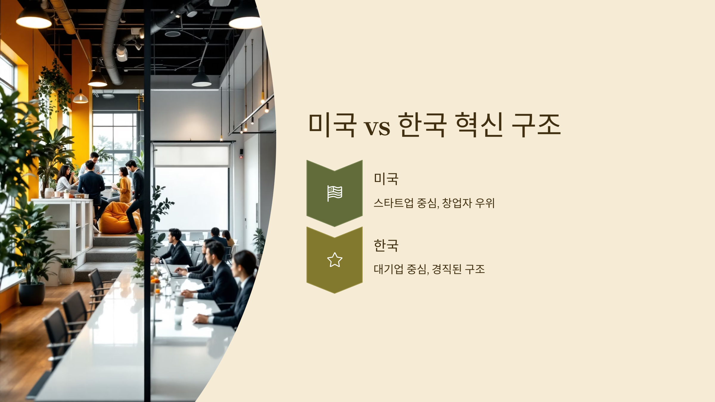 | 혁신 구조 | 스타트업 중심, 창업자 우위 | 대기업 중심, 경직된 구조 |