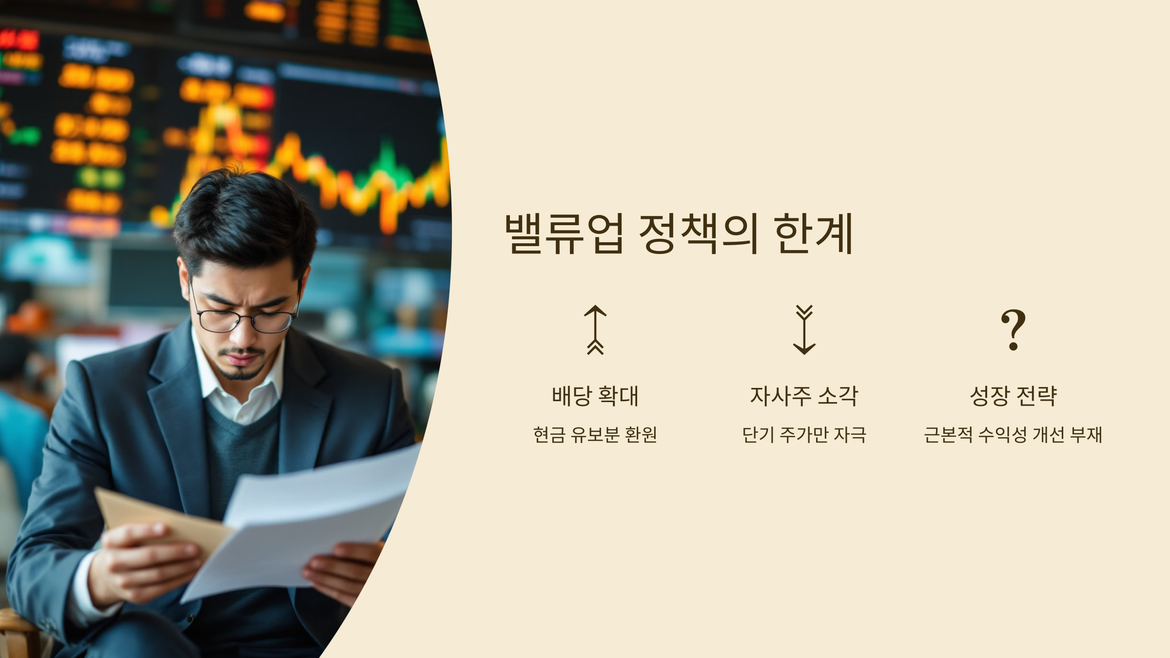 최근 정부가 내놓은 밸류업 정책의 핵심은 ‘배당 확대’, ‘자사주 소각’, ‘기업 설명회(IR) 강화’ 등 주주환원 중심이에요. 겉보기엔 좋아 보이지만, 뭔가 빠졌다고 느끼지 않으셨나요? 그렇죠. 기업의 근본적인 수익성 개선이나 미래 성장 전략은 쏙 빠져있습니다.