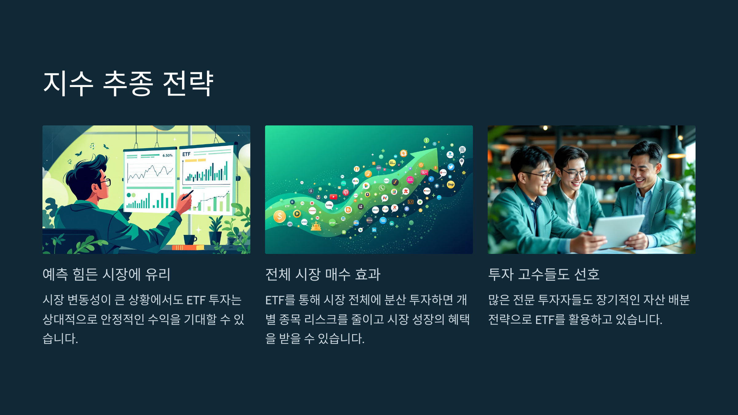 예전에 ETF가 막 나왔을 땐 다들 '그게 뭐야?' 하고 고개를 갸웃했어요. 그런데 지금은 이야기가 완전히 다르죠. 특히 최근처럼 예측하기 힘든 장에서는 전체 시장을 사는 전략이 오히려 더 유리하게 작용할 수 있거든요. 사실, 투자 고수들조차 개별 종목보다 지수 ETF에 자산을 몰아넣는 추세예요. 그 이유, 궁금하지 않으세요?