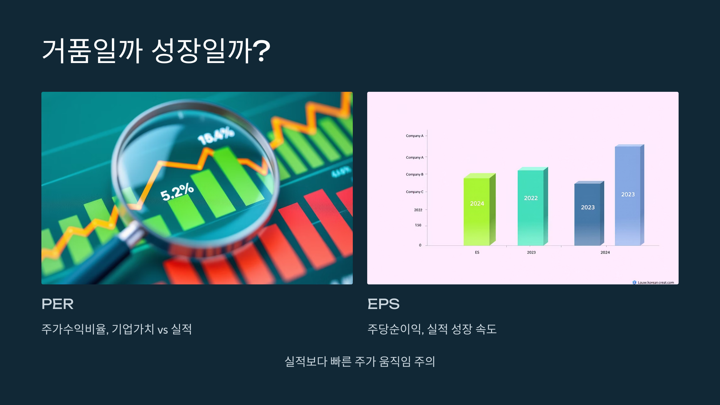 정책 수혜 기대감에 올라탄 종목들은 실적보다 주가가 더 빠르게 움직입니다. 그리고 이런 상황에선 PER, EPS 같은 기본 지표를 무시한 채 투자하게 되기 쉬워요. 결국 가격은 제자리로 돌아오거든요. 그 시점이 남보다 빨라야 수익으로 마무리할 수 있다는 거, 잊지 마세요.