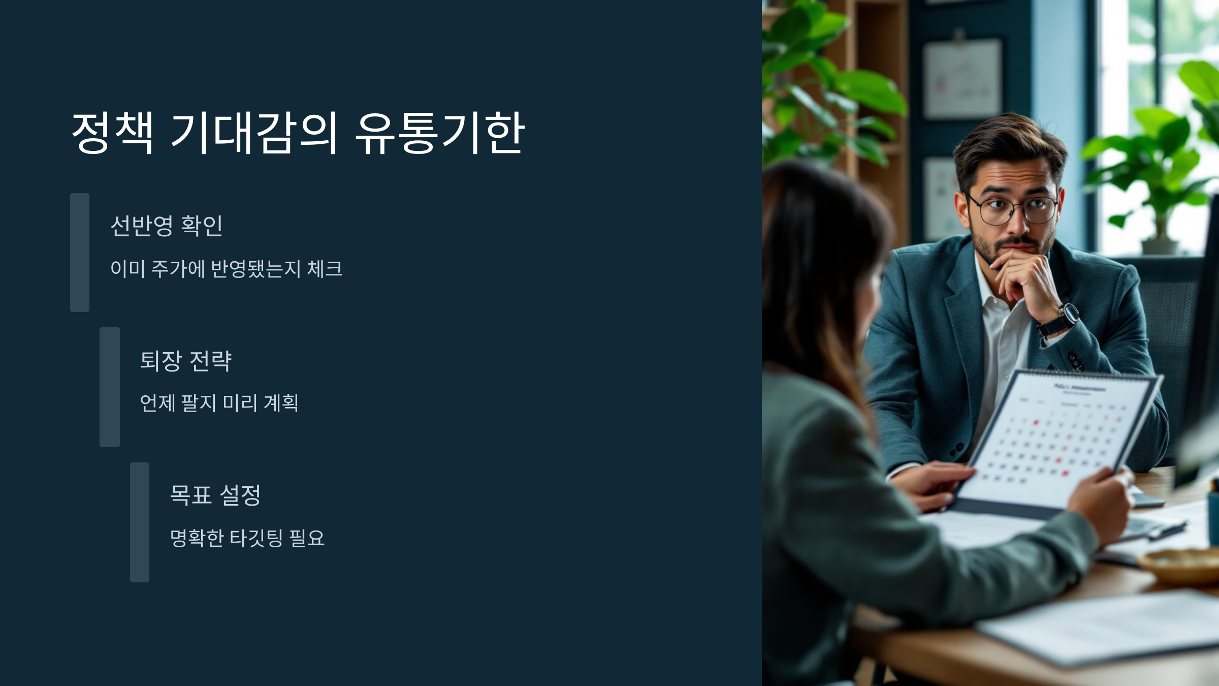 많은 사람들이 '지금이 타이밍이다'라는 착각을 해요. 하지만 정책 기대감은 바람처럼 불었다 꺼지는 게 특징이죠. 어떤 정책이 실제로 실행되기까지 시간이 걸리고, 그 안에서 여러 이슈들이 터질 수도 있으니까요.